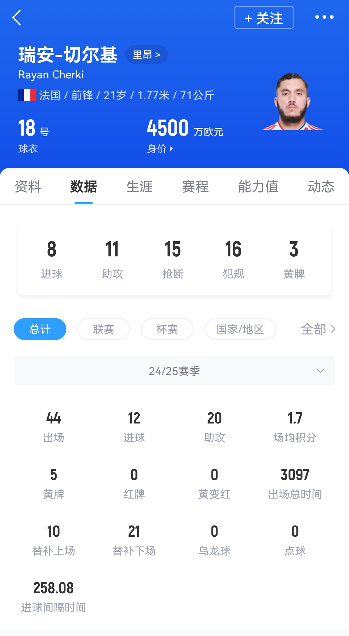 切尔基是里昂青训出身,2024/25赛季为里昂出场44次,打入12球20助攻。切尔基目前身价4500万欧元,他与里昂的合同还剩最后一年。